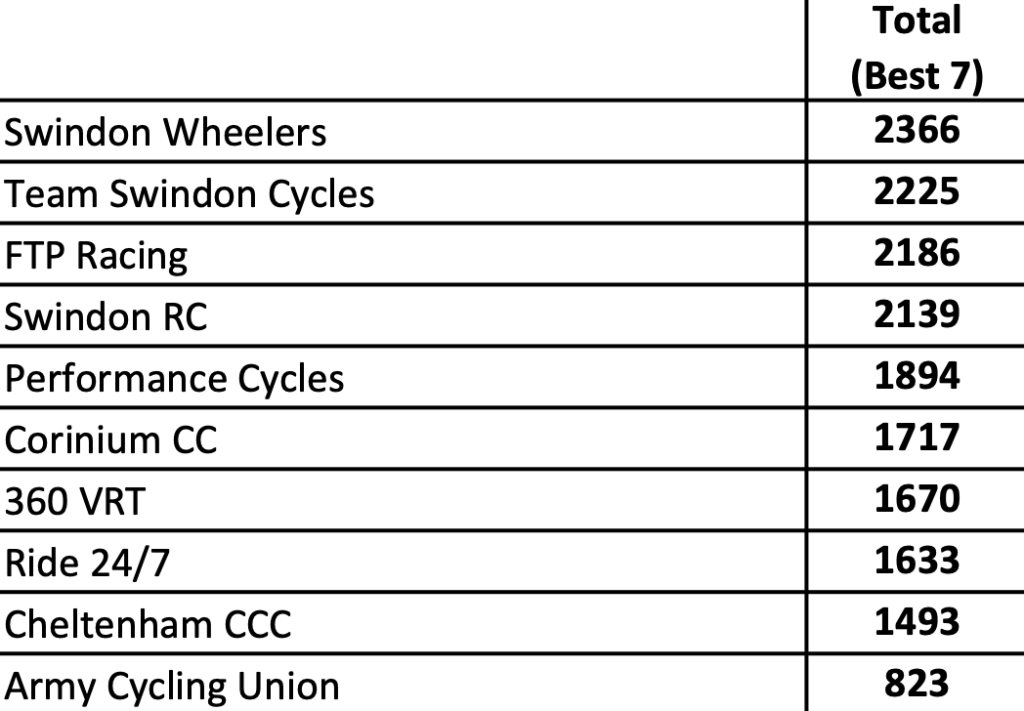 Swindon Wheelers CC took the crowning spot over the course of the ten week series – it was a real battle for the top 4 positions! The top ten club finishes can be seen on this table, taken from the Swindon RC website – full individual and inter-team results are published on their website!